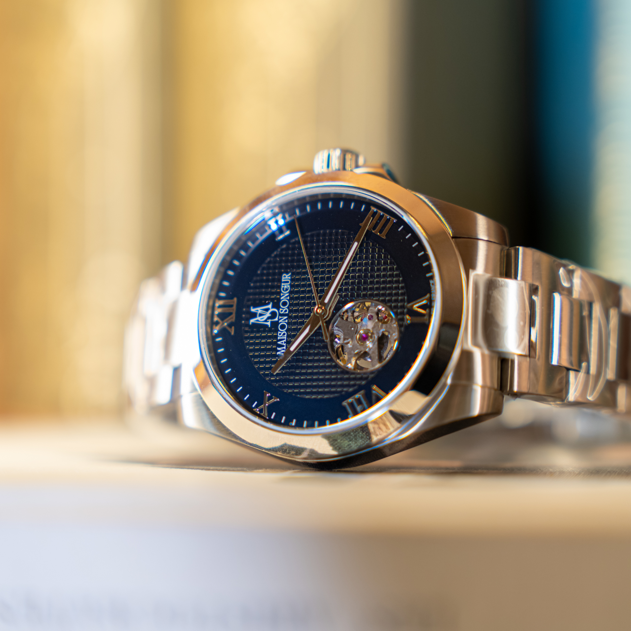Le cadran Clou de Paris, finement texturé, apporte profondeur et élégance, tout en mettant en valeur l’ouverture du mouvement. Pensée dans les moindres détails, la montre est dotée d’un fond de boîtier transparent en verre saphir, offrant une vue complète sur le mécanisme et prolongeant l’expérience horlogère. La signature Maison Songur vient parfaire l’ensemble, affirmant le caractère raffiné et singulier de cette pièce, fidèle à l’esprit de la Maison.