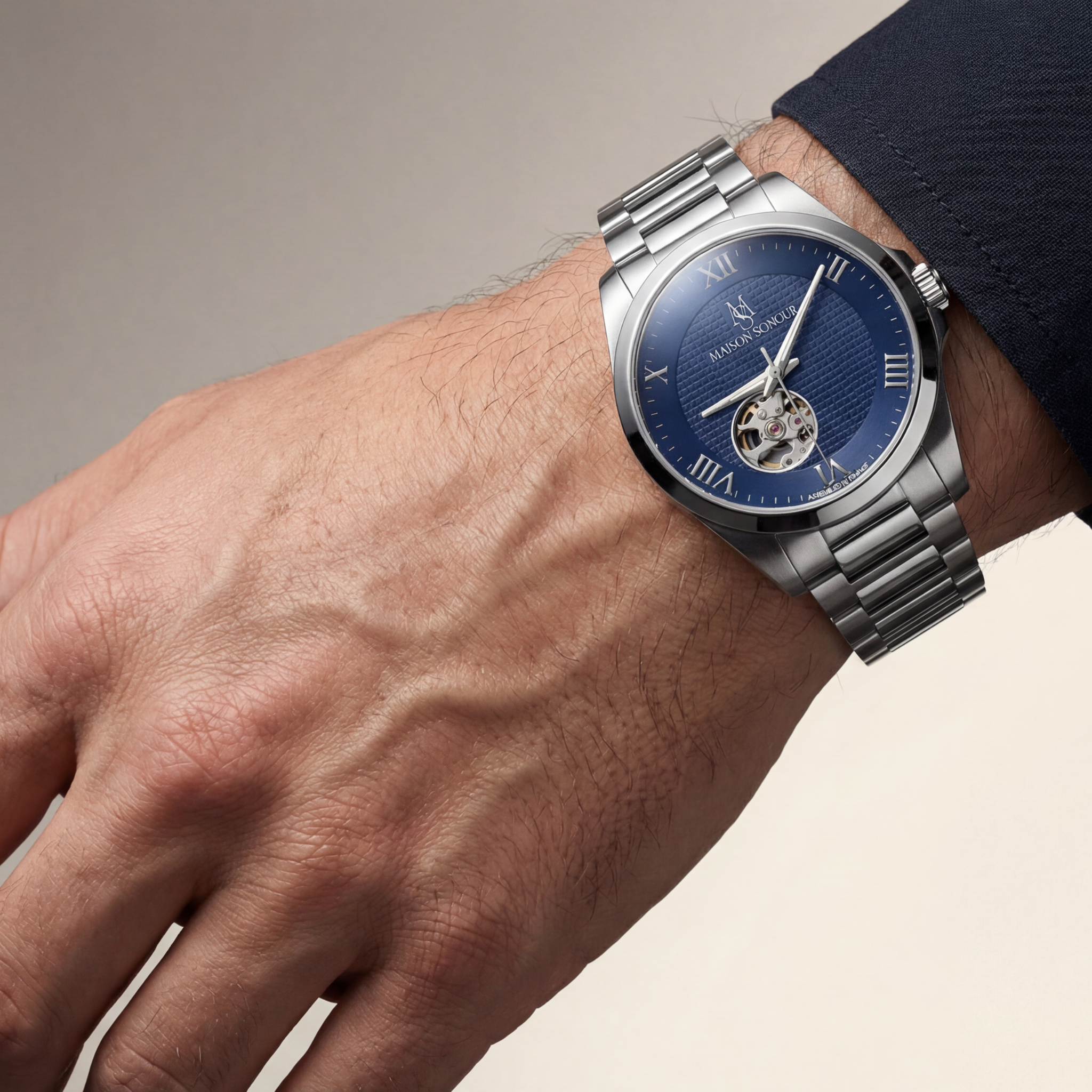 Le cadran de la MSNOVA se distingue par une ouverture à 7h, dévoilant le mouvement automatique avec subtilité et équilibre. Son cadran Clou de Paris, finement texturé, apporte profondeur et raffinement à l’ensemble, structurant la lecture du temps avec élégance.